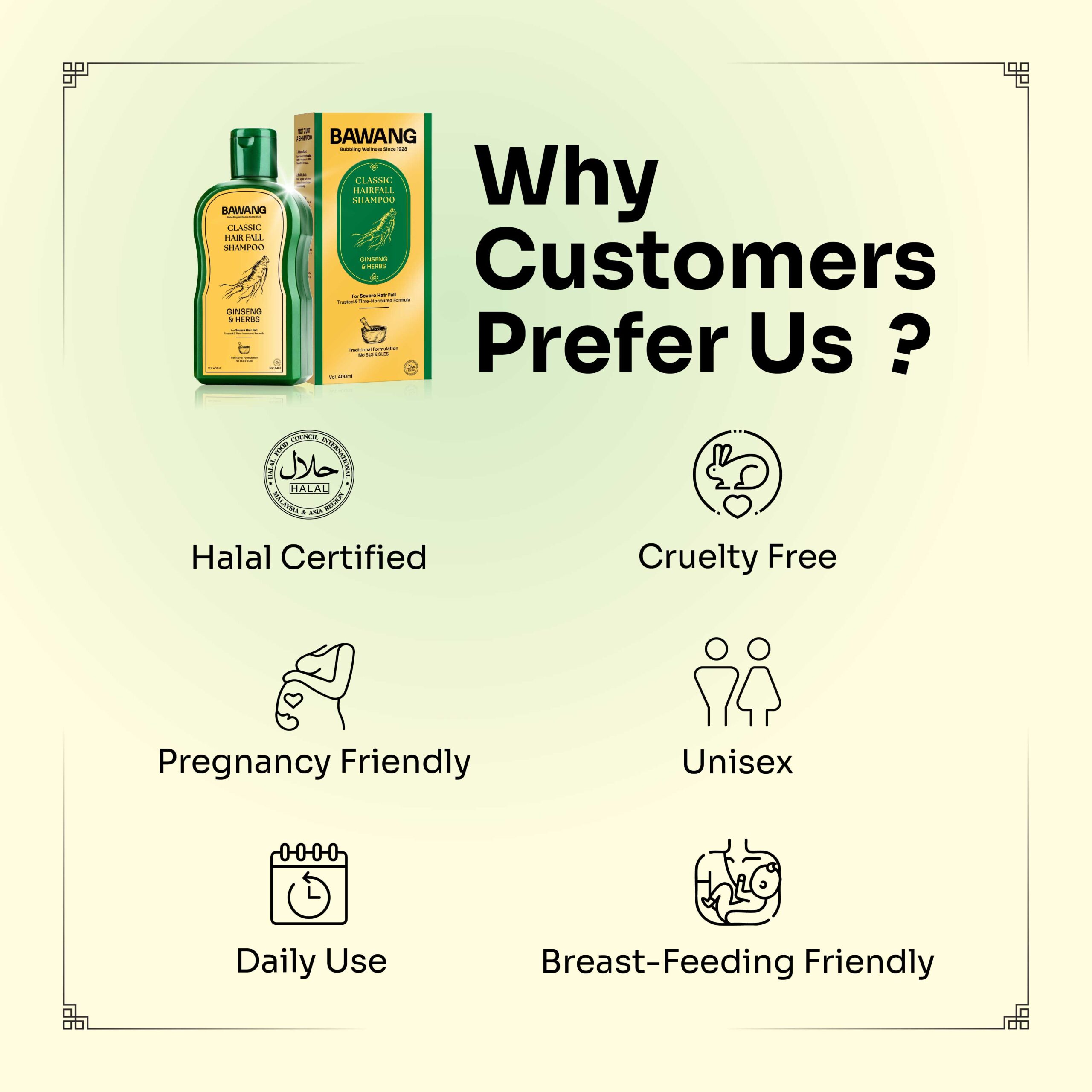 BAWANG Syampu Rambut Gugur Klasik 400ML ialah syampu herba rambut gugur dengan 5 herba Cina premium termasuk Ginseng, Notoginseng & Dong Quai. Dirumus khas sebagai syampu rambut gugur, ia membantu mengurangkan keguguran, dan bertindak sebagai syampu rambut lebat untuk rambut lebih sihat & tebal.