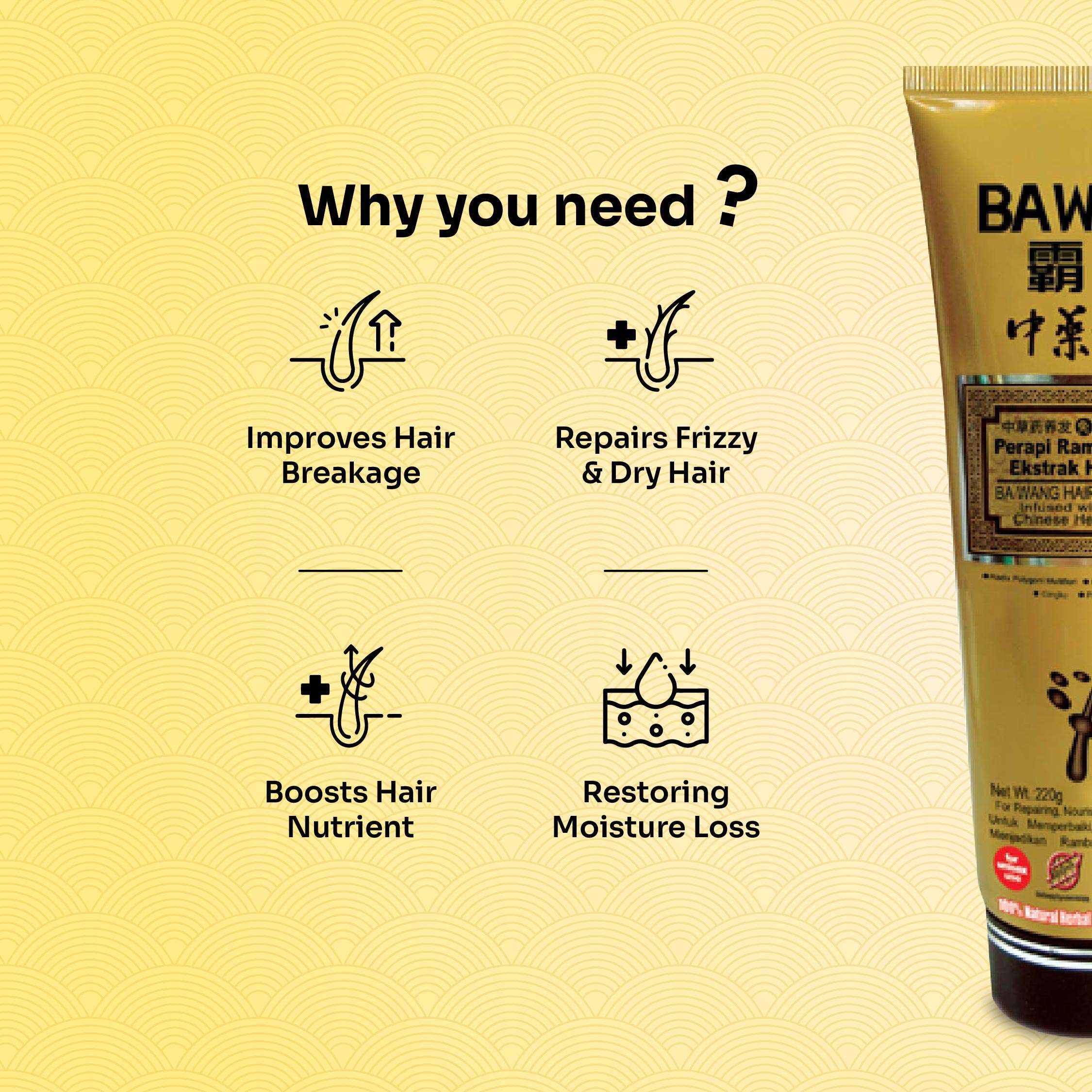 * Hint : Use BAWANG (6 herbs) Hair Strengthening & Root Firming shampoo after this starter therapy to maintain and preserve your hair growth.