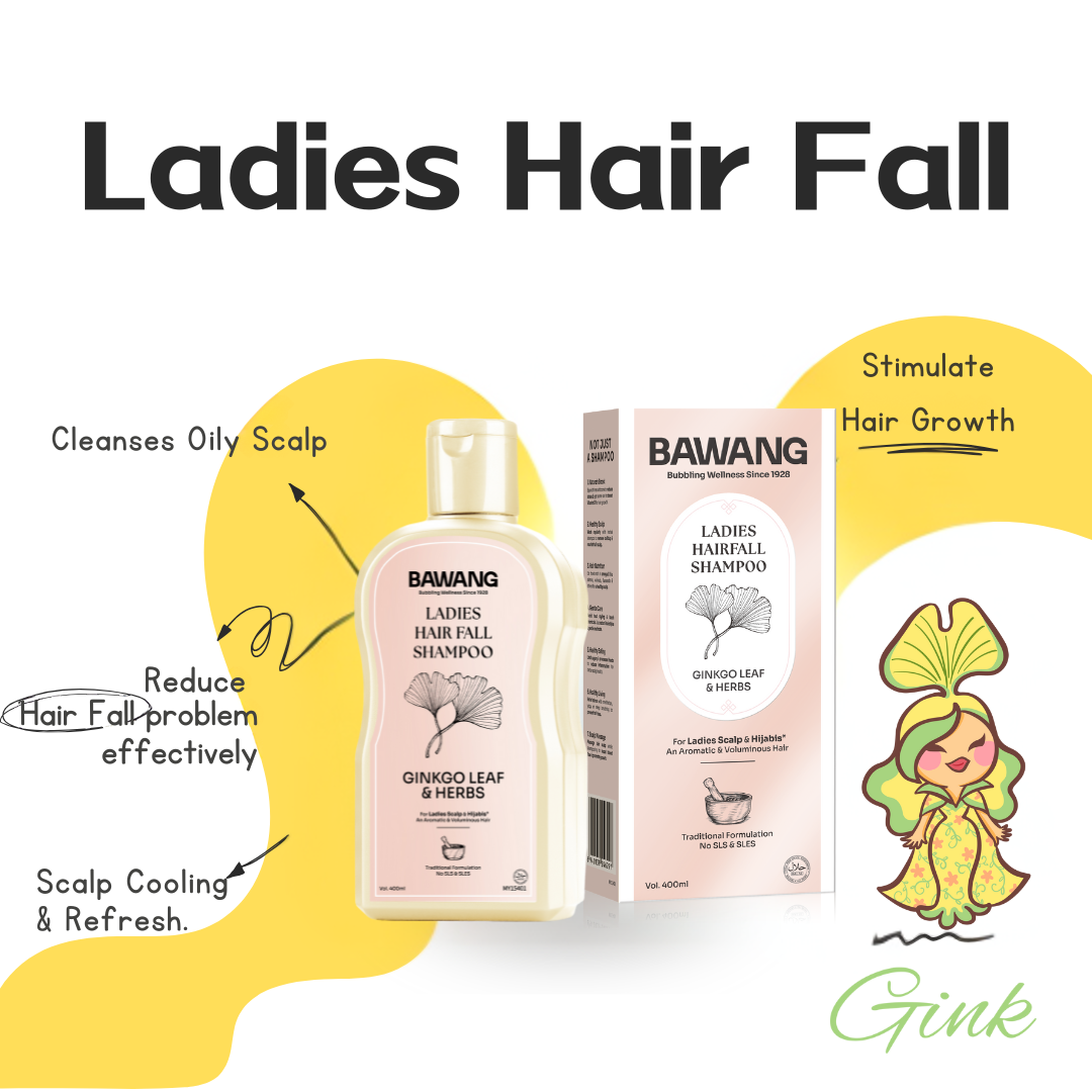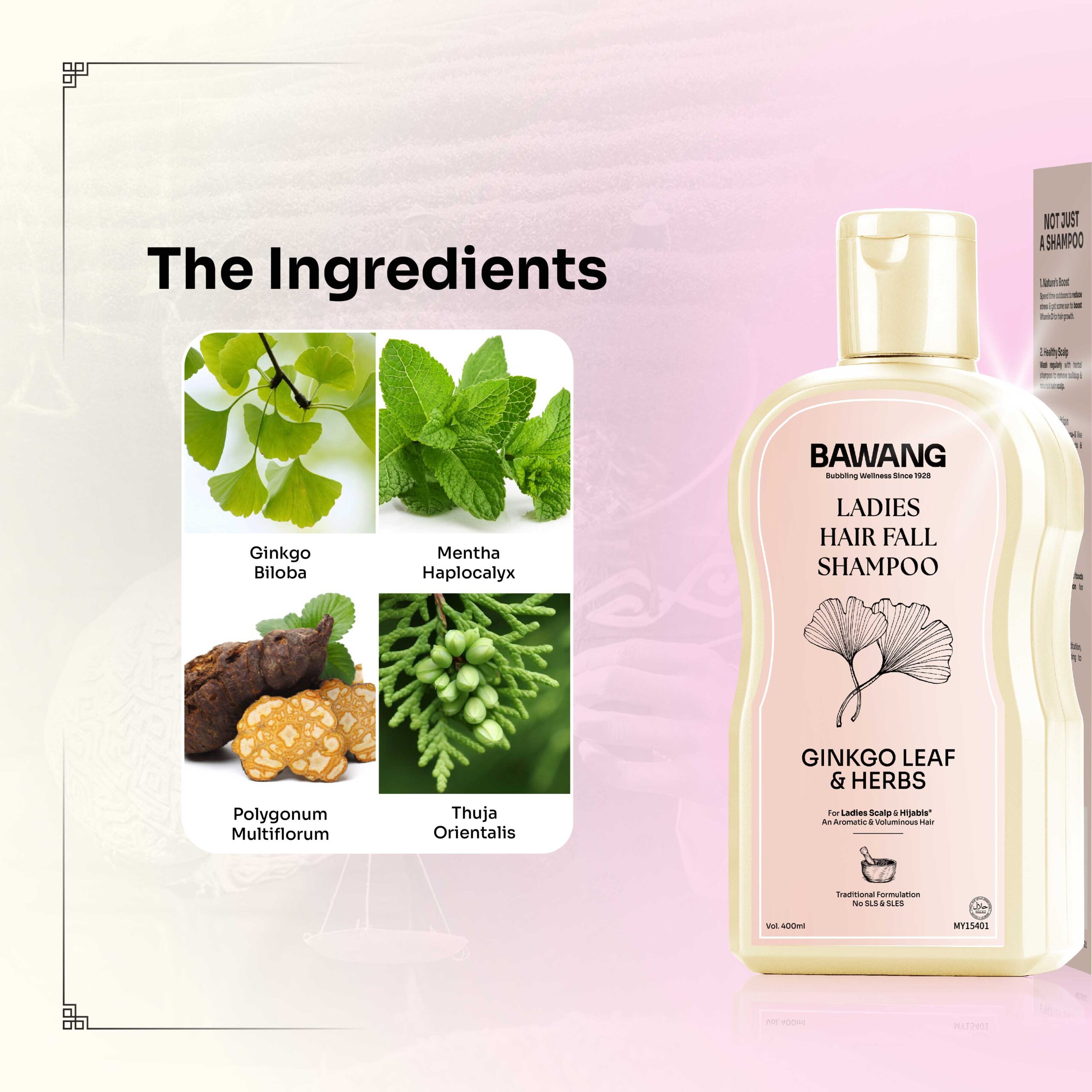 BAWANG Ladies Anti Hair Fall Shampoo (400ml) is a herbal shampoo made with 4 premium Chinese herbs including Ginkgo, Mentha, Polygonum, Thuja Orientalis. Specially formulated for women, this TCM herbal shampoo helps reduce scalp stress, control excess oil, fight dandruff, and boost nutrients for stronger roots. It promotes new hair growth while restoring natural shine and healthy volume.